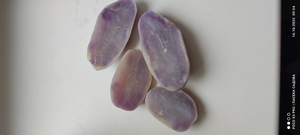 Здравствуйте! Интересный картофель, весь фиолетовый, непривычно. Купил и посадил 24.05.2025 г. из любопытства. Получил из десяти семенных клубней десятилитровое ведро. Клубни не мелкие и небольшие, очень удобно чистить и готовить. На вкус пока не пробовали но, уже поставили отварить пару клубней. Полную картину можно написать только на следующий год после уборки уже полноценного урожая. А пока на хранение для посадки.