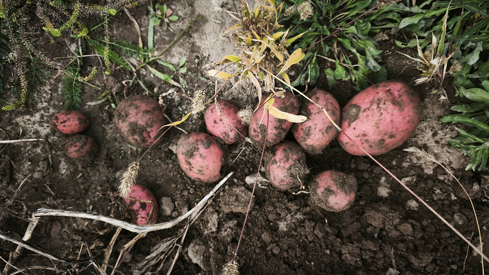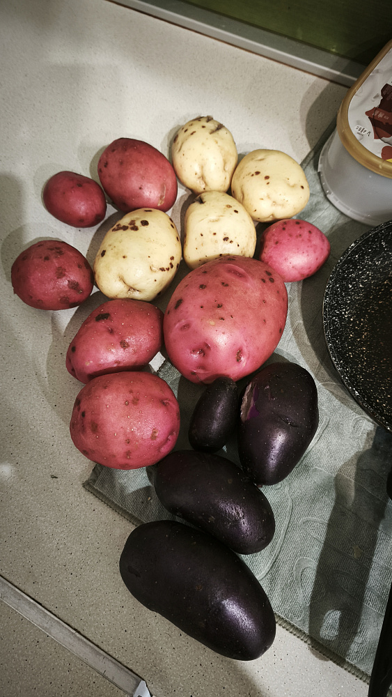 Первый раз посадили данный сорт, выкопал первый клубень 20.09.2025 картофель крупный. На фото жёлтый это Терра красный Роззара и фиолетовый Чудесник