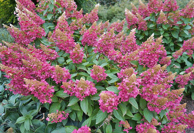 Изящное кружево для маленьких садиков. Растение компактное, хорошо держит форму, обильно цветет до самых холодов на побегах прошлого и текущего года. Цветки кремовые или белоснежные, собраны в пирамидальные метелки длиной 10 см. К осени приобретают розовый оттенок с красноватыми вкраплениями. Сорт подходит для клумб, срезки и контейнеров. Практически не поражается болезнями. Зимостойкость –30°C.