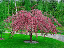 Раскидистая зонтичная крона в мае покрывается темно-бордовыми бутонами и малиново-красными цветками. Плоды декоративные, небольшого размера, долго остаются на ветках. Благодаря выразительному силуэту и изящным фиолетовым ветвям дерево сохраняет эффектный внешний вид осенью и зимой.