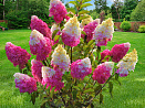 Новый и очень популярный сорт. Куст компактный за счет укороченных побегов, поэтому не требует подвязки к опорам. Декоративно все растение. Ветви имеют вишневую окраску, листья – ярко-изумрудную. Некрупные цветки собраны в громадные (до 55 см в длину) конусовидные соцветия. В июне они белые, затем постепенно розовеют, а к августу становятся огненно-красными. Интересно, что верх соцветия долго остается белым, а низ быстро краснеет. Впечатление ошеломляющее! Растение нетребовательно к почвам, обладает повышенной морозостойкостью ( до -35 °С), устойчиво к болезням. Не нуждается в зимнем укрытии.