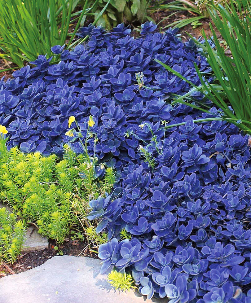 Этот очиток действительно синеватый, но, конечно, не как на фото. Саженец приходит зелёный, потом только набирает цвет. В клумбе смотрится замечательно. Зимует отлично.