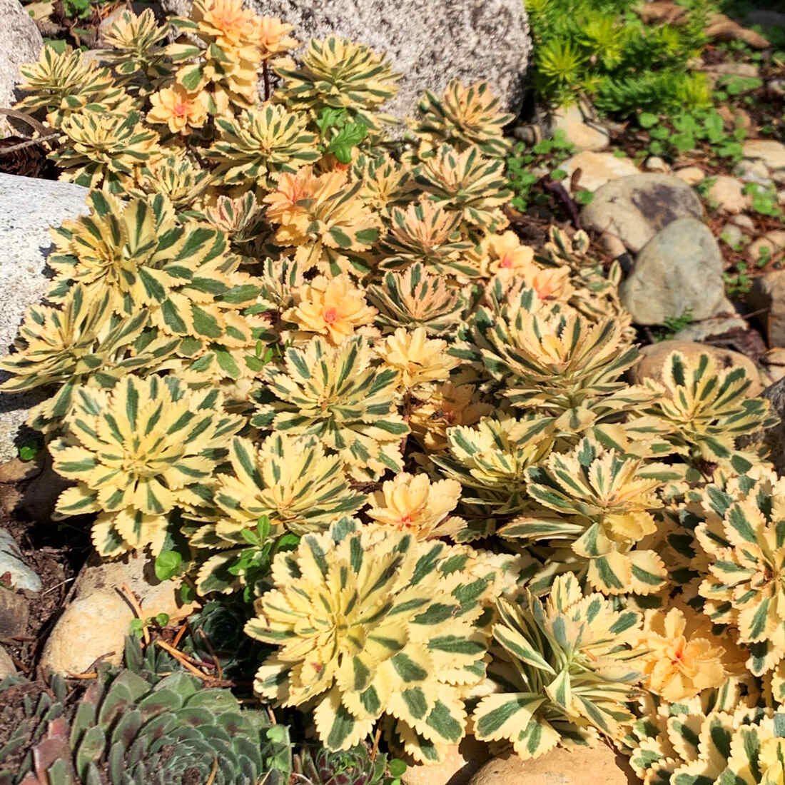 Поражает необычное сочетание центральной части зеленых листьев с кремовыми ажурными краями. Словно кружевница поработала над этой воздушной красотой. Собраны листья в эффектные, очень декоративные розетки, которые покрываются желтыми, солнечными соцветиями. С каждым годом растение набирает силу и расползается на расстояние до 45 см. Хорошо себя чувствует на песчаных, скудных почвах, при этом не любит соседства с сорняками. Не поражается болезнями и вредителями.