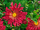 Неповторимое совершенство! Яркие красно-малиновые трубчатые лепестки в сочетании с желтыми сердцевинками. Контрастные белые штрихи в виде тонких стрелок усиливают эффектность образа. Шаровидный, не высокий куст в течение сезона как будто напитывается солнечным светом и интенсивно отдает его осенью, врываясь в мир активным цветением. В тени теряет нарядность. Не любит сквозняков.