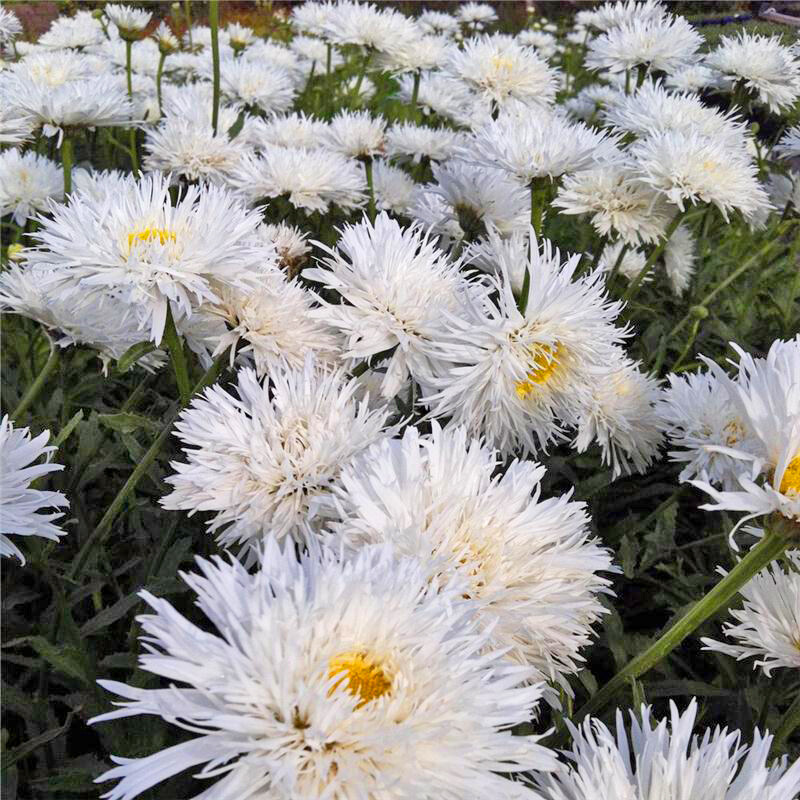 Похож на хризантему, такой же пышный, махровый и задорный. Красивые крупные белые цветки, до 12 см в диаметре, с сильнорассеченными лепестками. Длительное и буйное цветение. Куст шириной около 40 см.
