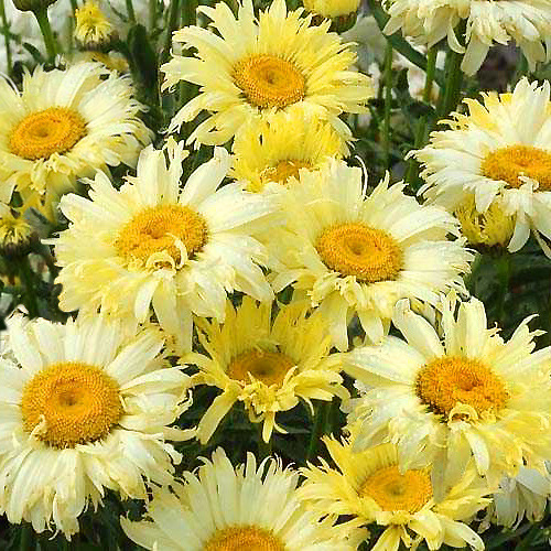 Большие полумахровые ромашки из лимонно-желтых, рассеченных по краям лепестков. Гармонично сочетается с колокольчиками, маками и васильками. Стебли крепкие, прямые, слабоветвистые с темно-зелеными ланцетными листьями.