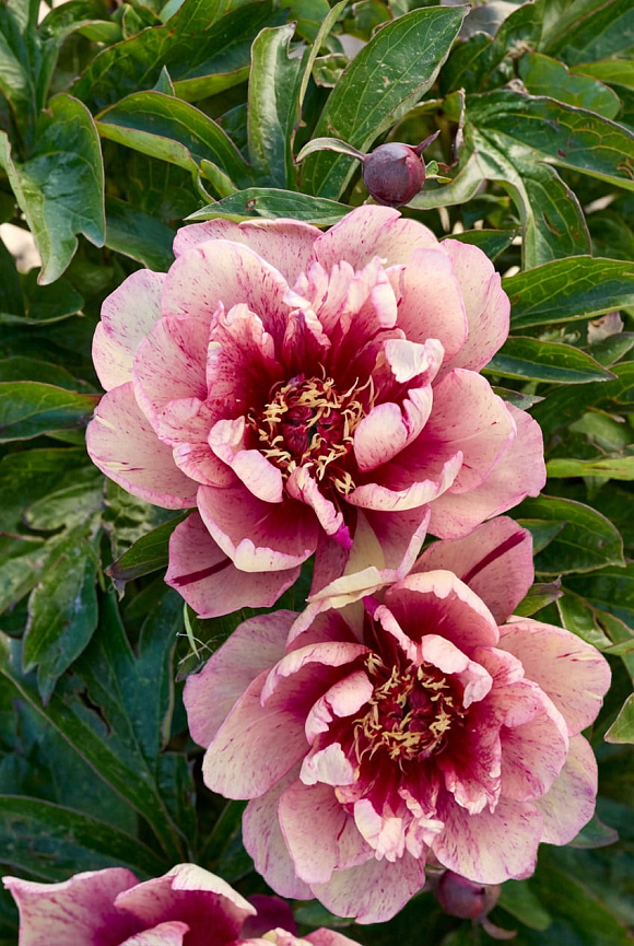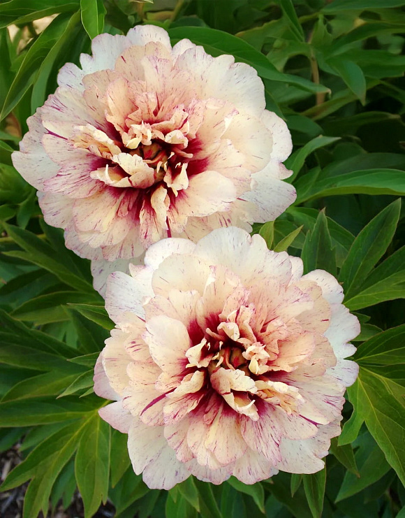 Один из самых эффектных ИТО-гибридов с крупными цветками теплой абрикосово-персиковой гаммы. Окраска лепестков выразительная с редкой художественной палитрой: нежный фон украшен розовыми, малиновыми и бордовыми штрихами и пятнышками. Каждый цветок выглядит непохожим на другие, и в этом особое очарование сорта: окраска словно играет, становится глубже и объемнее по мере роспуска. На одном взрослом кусте за лето появляется от 50 до 80 бутонов! Куст сильный, аккуратный, с прочными стеблями и густой рассеченной листвой, которая остается декоративной весь сезон. Зимостойкость до −40 °С.