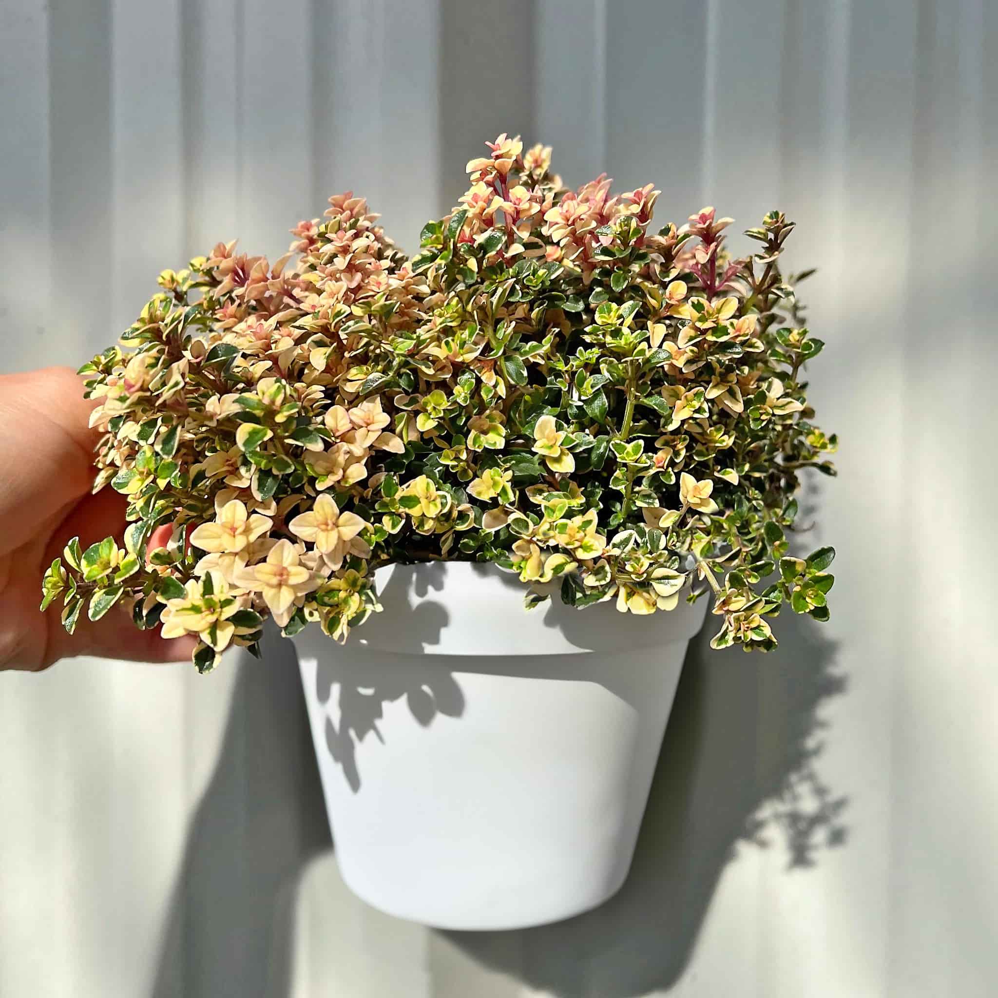 Утонченный пестролистный тимьян с округлыми зелеными листьями, украшенными кремово-желтой каймой. Издает островатый цитрусовый аромат. Цветки мелкие, нежно-розовые, собраны в небольшие соцветия. Кустик аккуратный, стелется вширь, быстро образует плотную подушку диаметром до 50 см.