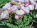 Тюльпан, который сложно забыть. Огромное пышное соцветие, собранное из десятков перистых лепестков. Контрастная игра оттенков: с мягкими переходами от кремово-белого к светло-розовому, словно облако, застигнутое на закате. Цветет в конце сезона – когда сад нуждается в эффектной точке.