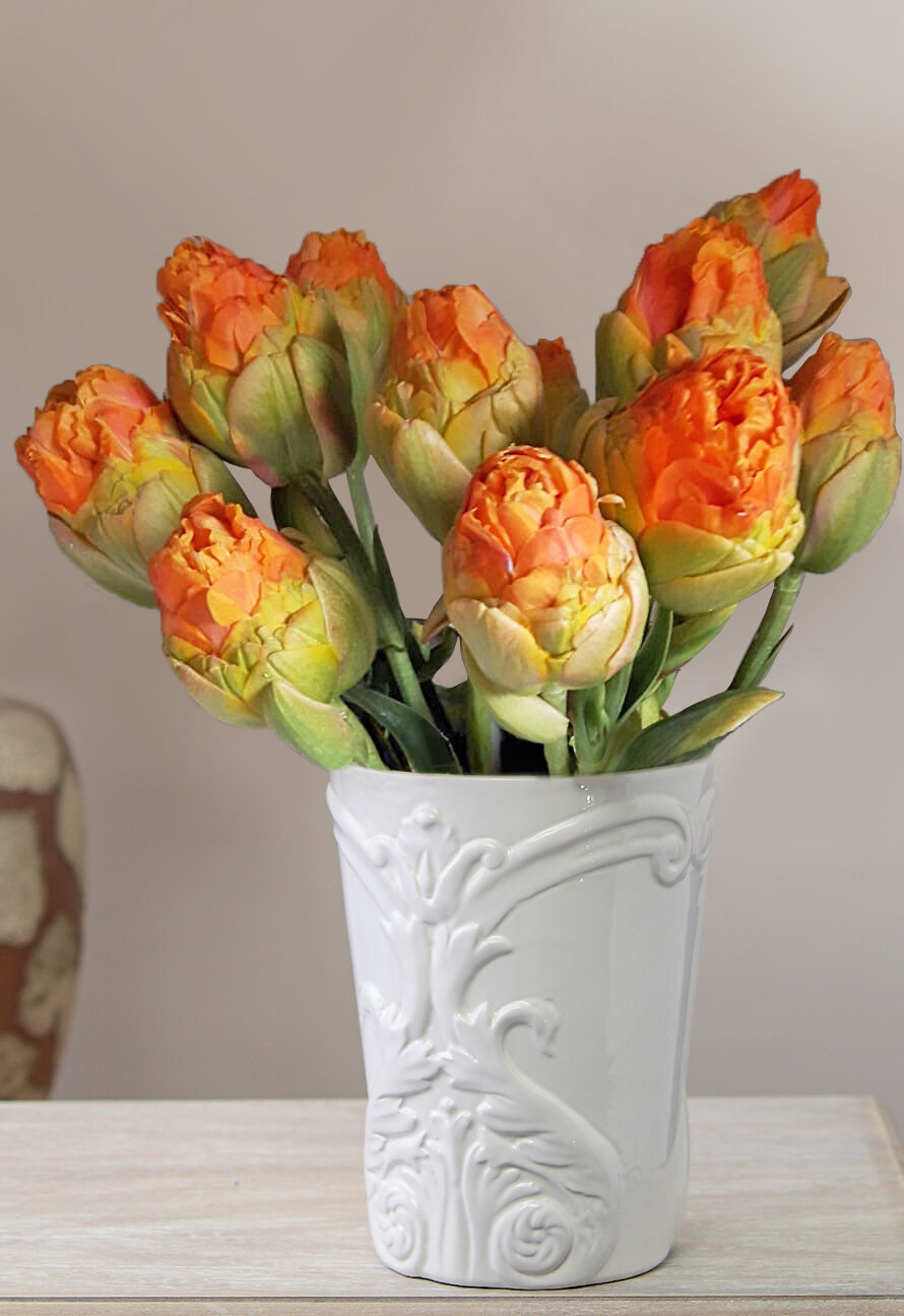 Уникальная форма соцветий высотой 8 см. Внешние салатовые лепестки заостренные и плотные, а оранжево-желтые внутренние – гофрированные, воздушные, с рваными краями. Удивительный контраст текстур и оттенков. В полном раскрытии соцветие напоминает пион.