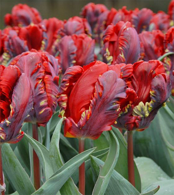 Экстравагантный сорт, напоминающий яркие и пышные перья экзотической птицы. Волнистые и изогнутые лепестки окрашены в оттенки красного, пурпурного и зеленого. Крупные, выразительные соцветия необычной формы делают тюльпан идеальным акцентом в любом саду.