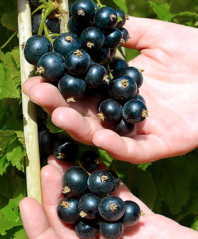 Уже на второй год после посадки урожай 1 кг, а затем, быстро нарастая, урожаи достигают 3 кг с куста и более. Ягоды крупные, блестяще-черные, массой до 3 г, почти не осыпаются, даже перезревая. Вкус выше всяких похвал — настоящий десертный, имеет высшую дегустационную оценку. Созревание дружное. Отрыв сухой, поэтому ягоды неплохо хранятся и выдерживают транспортировку. Сорт самоплодный и устойчивый к грибковым болезням.