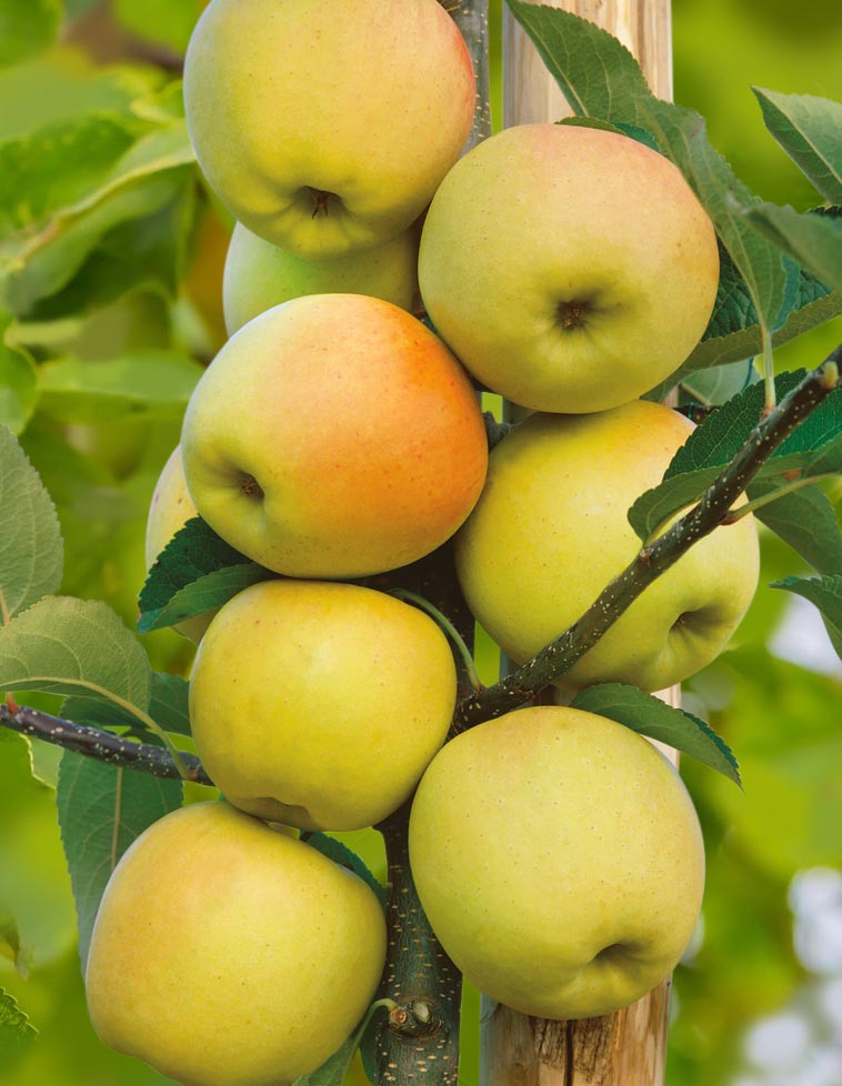 Быстрорастущее, малогабаритное и компактное (около 2,5 м) дерево с завидными характеристиками урожайности для колонн - до 12 кг с дерева! Необычайно раннеспелый скороплодный сорт, первые яблочки созревают уже в конце июля. Плоды 110-140 г, десертного вкуса, кислосладкие и сочные, имеют ярко выраженный аромат (дегустационная оценка 4,8 балла из 5). У них плоская форма, ярко-желтый окрас, плотная мякоть белого цвета. Хранятся около месяца, но съедите вы их намного быстрее, уж больно они хороши. Деревце самобесплодное, высокоустойчиво к парше. Имеет иммунитет к вредителям и паразитам. В плодоношение вступает, как правило, на 3 год после посадки. Для сорта характерна удивительная зимостойкость до -40 °С.