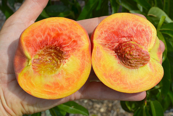 Сочность зашкаливает. Самоплодный сорт персика с удивительно сладкыми очень ароматными крупными плодами (150-250 г) со вкусом земляники и манго, еле заметной кислинкой и желто-кремовой мякотью. Кожица желто-оранжевая с кирпично-красным румянцем. Консистенция маслянистая. Косточка свободная. Сорт с хорошей завязываемостью плодов, которые созревают в конце августа. Неприхотлив в уходе. Растение до 3 м в высоту. В плодоношение вступает рано, полноценное уже на 2-3 год. Стабильная и высокая урожайность. Дерево с хорошей сопротивляемостью к курчавости и грибным заболеваниям. Зимостойкость до -25°С. Самоплодная культура.Персик – плодовое косточковое дерево из семейства Розовые род Слива. Еще совсем недавно персик можно было выращивать только на юге нашей страны.