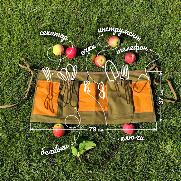 В кармашках найдется место для всех инструментов - секатора, совка, рыхлителя, ножниц, садовых ножей, не забыт отсек и под блокнот для записей или пакетика с семенами. И конечно же предусмотрено отделение для телефона и очков. Все и всегда будет под рукой и в полном порядке.