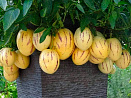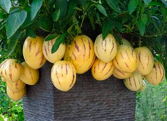 Другое название растения – дынная груша. Интересно своими плодами молочно-белого цвета с контрастными сиреневыми полосками. Мякоть плодов сочная, кисло-сладкая, с сильным ароматом дыни и фруктовым привкусом. Едят их свежими, добавляют в салаты, сушат или консервируют. В холоде плоды хранятся до 2,5 месяцев. Вечнозеленое многолетнее растение, может выращиваться в теплицах, а на зиму его переносят в теплое место. Уход такой же, как за томатами или баклажанам. Обязательно регулярное пасынкование.