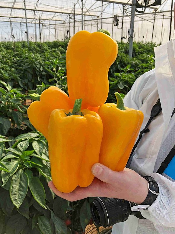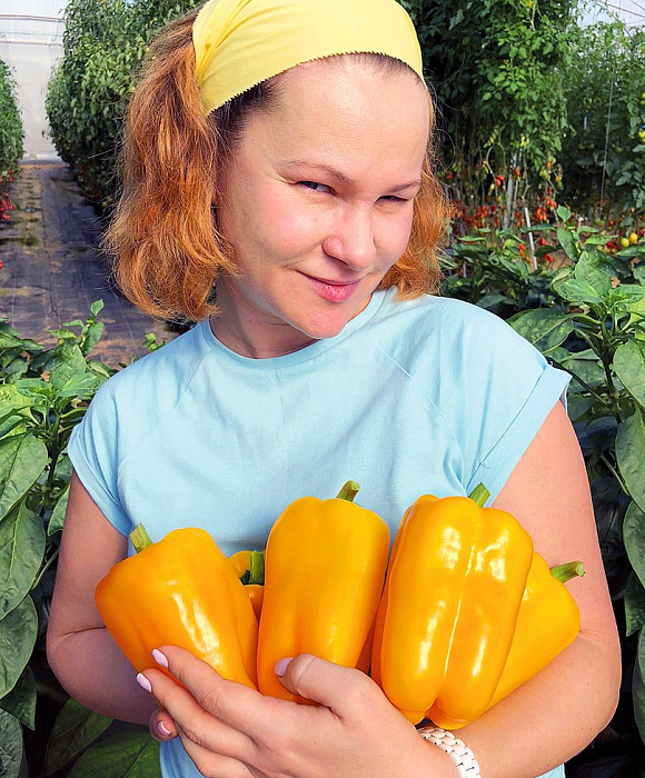 Аппетитные блестящие ярко-желтые перцы, сочные, хрустящие, сладкие и ароматные. Плоды крупные, слегка вытянутые, диаметром 11 и длиной 18 см. Стенки толстые, около 8 мм. В стадии технической зрелости – зеленые, затем желтеют. Хорошо хранятся и транспортируются. Растения высотой 90-100 см, на квадратном метре их размещают 2-3. Гибрид спокойно переносит недостаток света, пониженные температуры, устойчив к наиболее вредоносным болезням. Для выращивания в закрытом и открытом грунте.