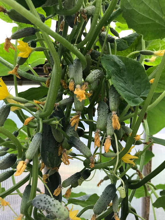 Действительно много огурчиков и плодоносят без остановки. Не болеют. Округлой формы с вытянутыми жопками. Как на фото в отзывах, а не на промофото. И они не мясистые, а сочные, можно сказать полые, одна вода на плотных стенках - и шкурка грубовата, относительно других.