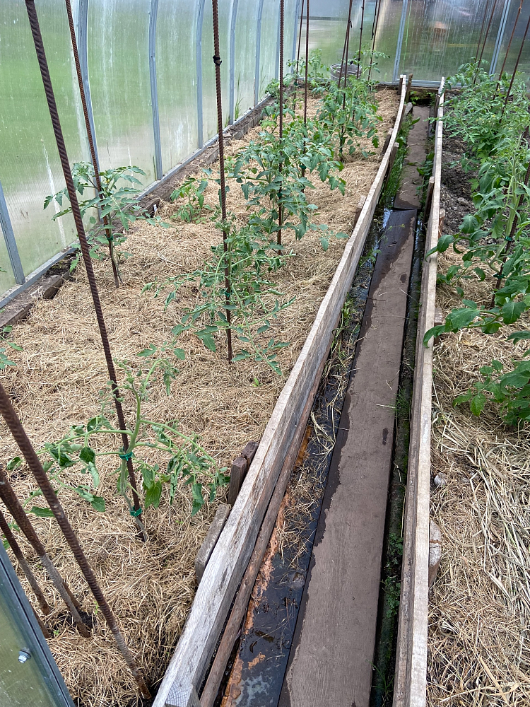 Еще раз поливают из лейки через насадку «душ» раствором кальциевой селитры из расчета 1 столовая ложка на 10 литров теплой воды. Засыпают политые томаты оставшейся сухой землей. Сверху больше не поливают. Визуально это выглядит, как будто томаты посажены в сухую землю. Обычно со следующим восходом солнца томаты уже поднимают макушки и принимают горизонтальное положение.