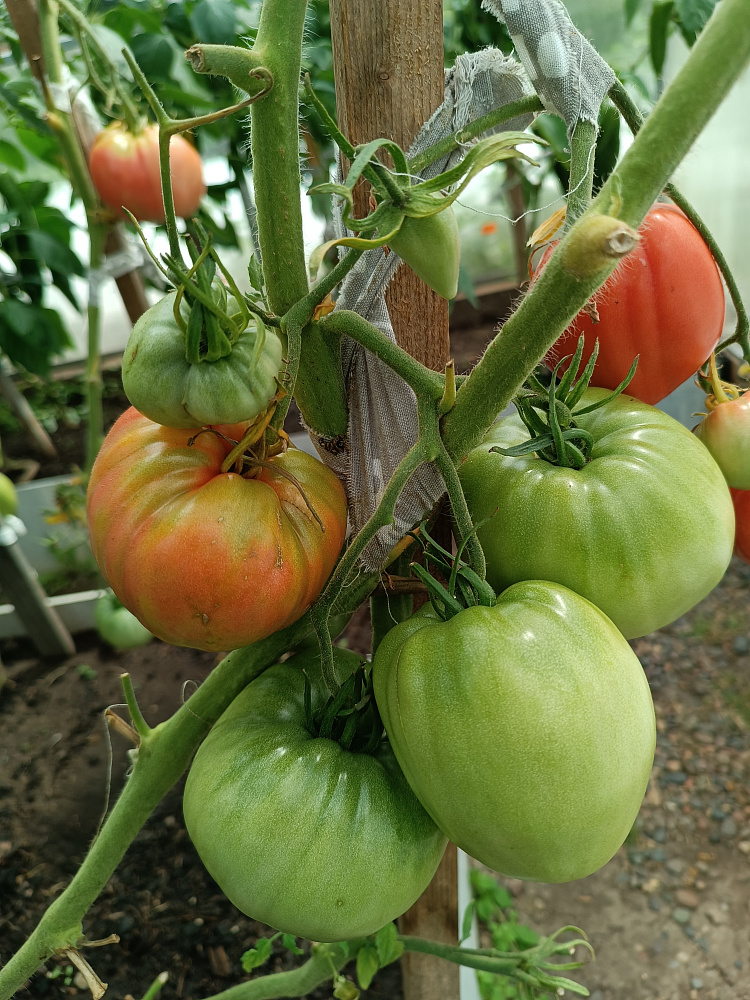 У биф-томатов необходимо регулировать количество завязи в кистях. Всего в кисти нужно оставить 3-4 плода, остальные цветы отщипнуть. Тогда помидор будет действительно крупным.