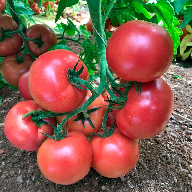 Среднеспелый розовоплодный гибрид полудетерминантного типа роста. Благодаря компактности и коротким междоузлиям, быстро вступает в фазу плодоношения и формирует массовую завязь, обеспечивая высокий урожай. Плоды округлые, интенсивно-розовые, все одного калибра, с сочной ароматной мякотью. Не растрескиваются. Формировка не требуется. Подходит для низких теплиц.