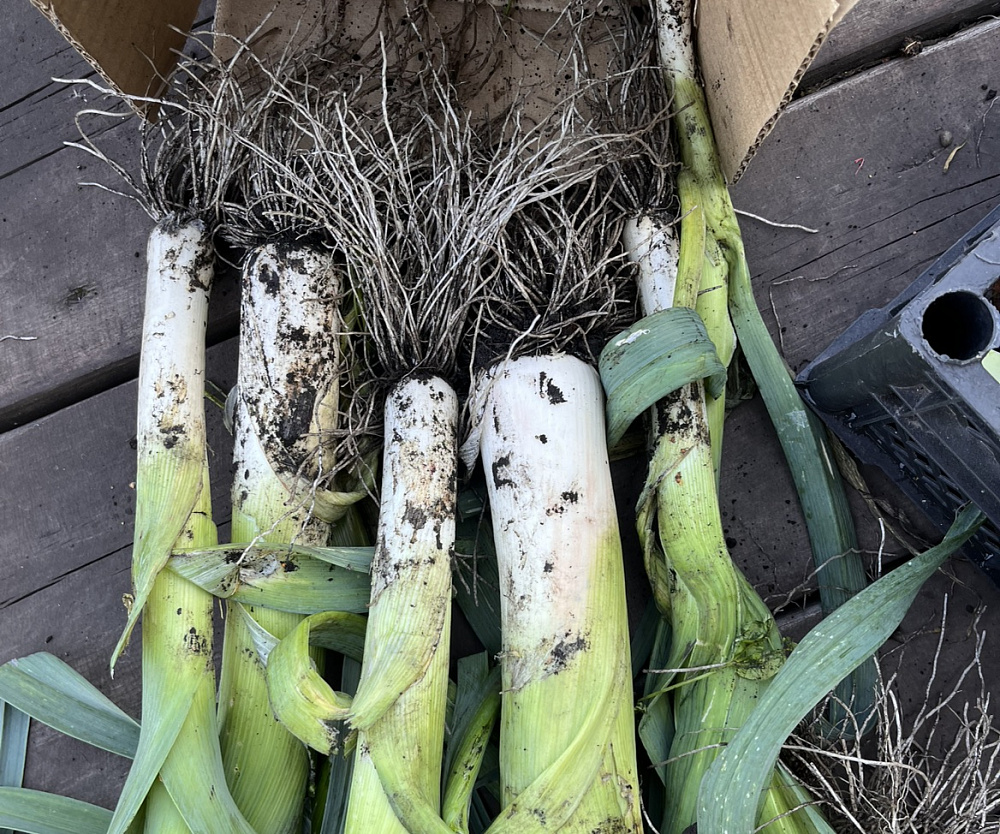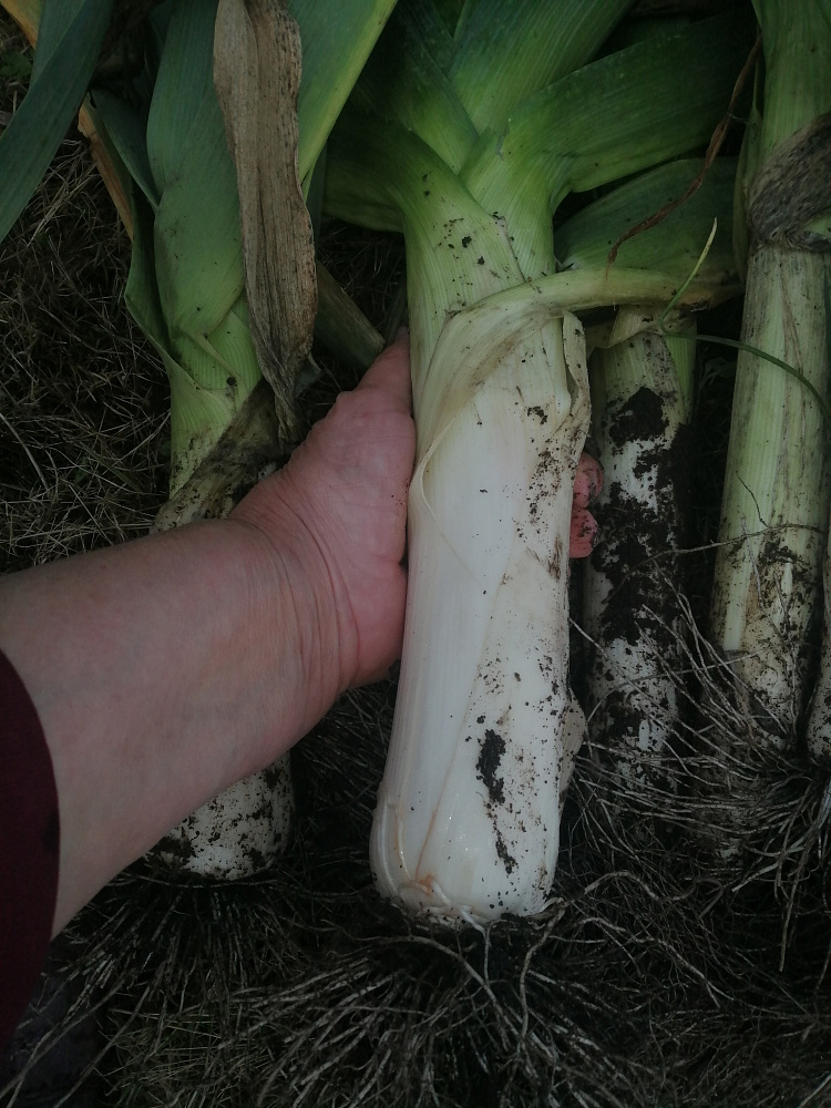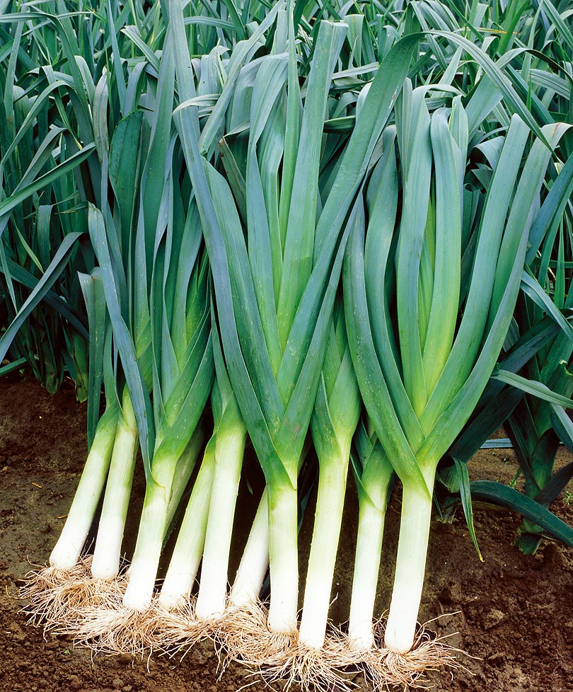 Позднеспелый лук порей убирают пред самыми заморозками. У собранных растений удаляют поврежденные и грязные листья, подрезают корни до длины 1 см и примерно на одну треть листья.