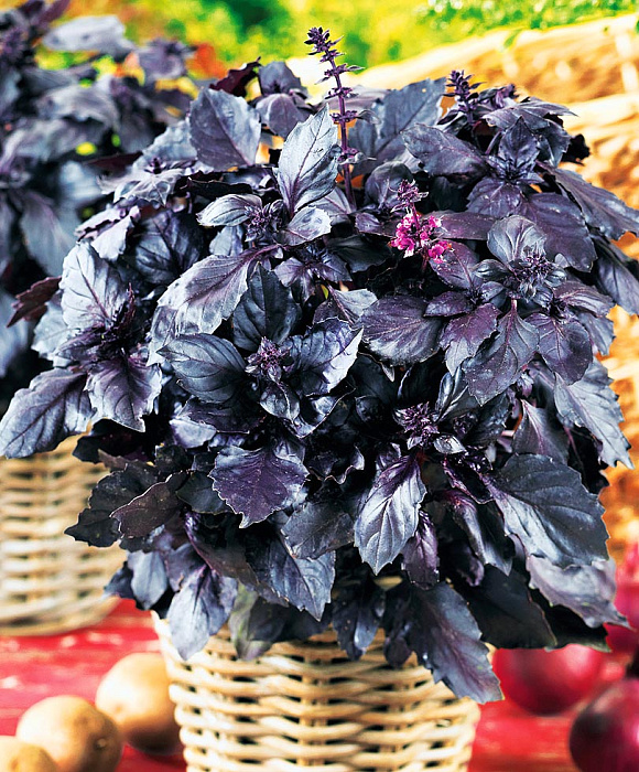 это относится к базилику. Базилик Опал насыщенного фиолетового цвета, очень нежный и ароматный. Запах его тонкий и