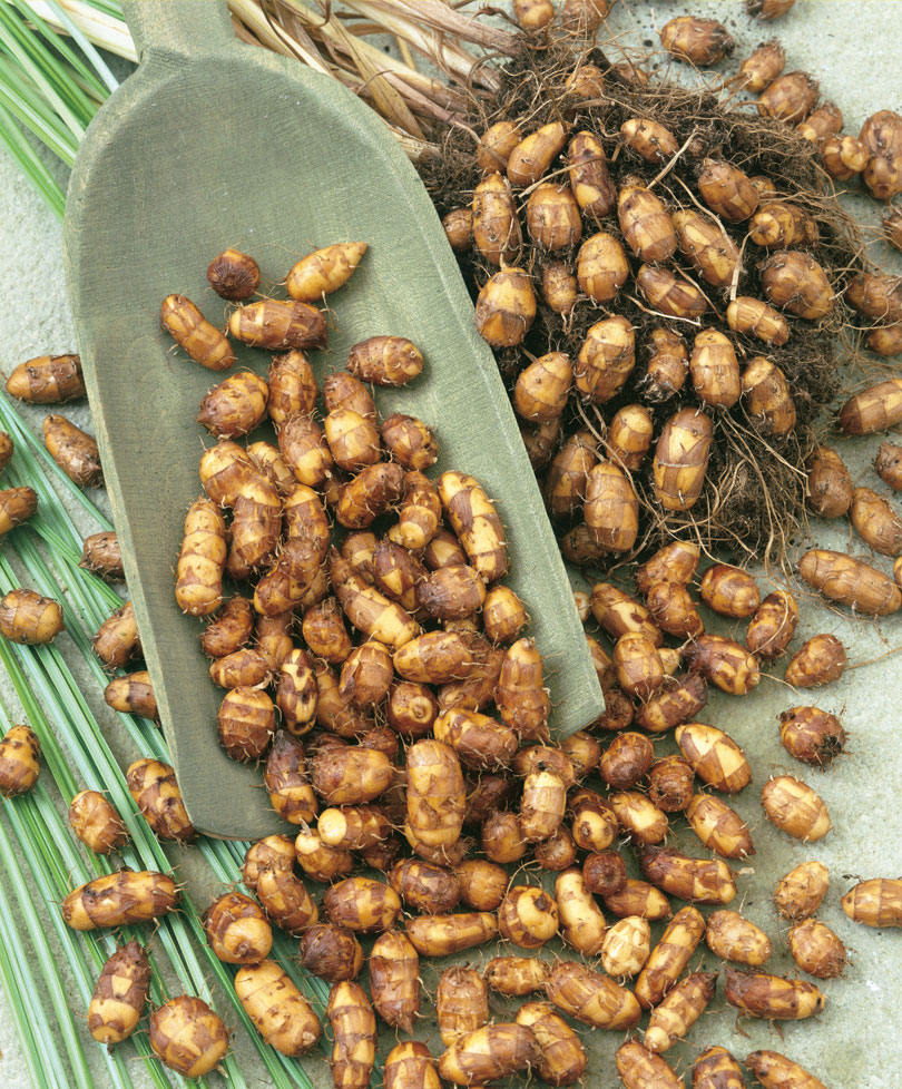 завязывается огромное количество, до 600, продолговатых клубеньков. Они богаты витаминами С и Е, микроэлементами кальцием, магнием, железом, фосфором. Чуфа повышает иммунитет, увеличивает работоспособность, придает бодрости, улучшает умственные способности. Высушенные орешки могут храниться в сухом помещении при температуре +10-18°С в течение 2-3 лет, сохраняя при этом всхожесть и свои вкусовые качества.