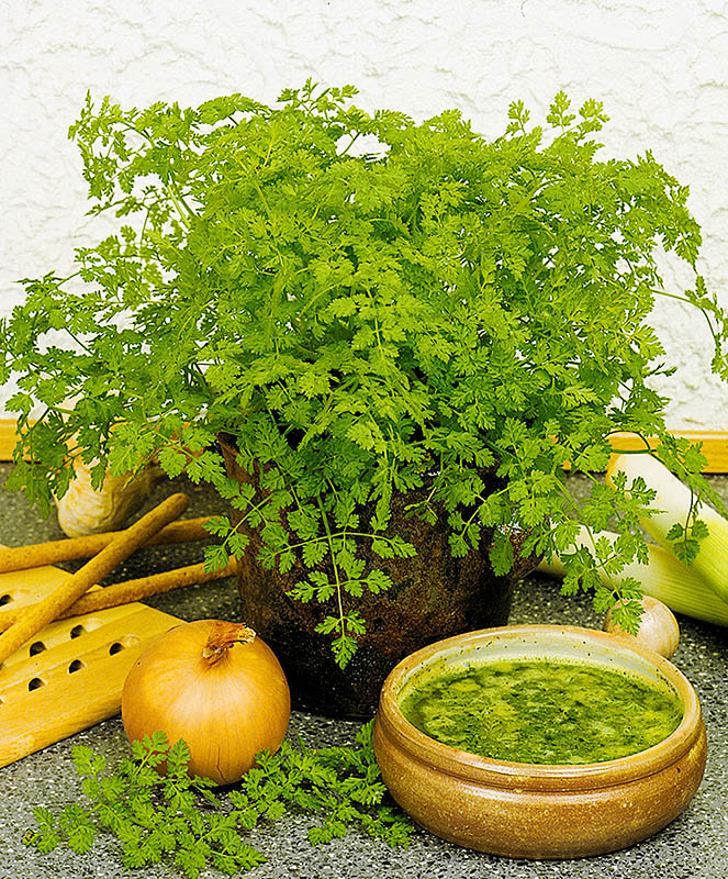 петрушку, но выгодно отличается от неё тонким анисовым приятным ароматом и более сочными нежными листьями. Растёт быстро.