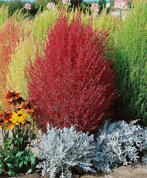 Кохию все чаще и чаще теперь можно встретить на каждом садовом участке, как яркий штрих ландшафтного дизайна. Легко стричь и придавать форму этим высоким, похожим на кипарисы, чудо растениям. Выращивается она из семян через рассаду очень легко, и даже тот, кто не посадил еще в своей жизни ни одного цветочка, справиться с ее выращиванием без труда. Кохия – представитель семейства Маревые, ее родина - Китай. Пушистые кустики кохии имеют высоту более метра, а в диаметре она будет такой, как вы сами того пожелаете, и какой вы ее сделает. Как вы ее подстрижете и какую форму придадите, такой она и будет. Вы для кохии – личный парикмахер. Полет вашей фантазии не ограничен ничем. Осенью, когда все наряжается в золото и багрец, не отстает и кохия. Она меняет свой окрас и принимает разнообразные оттенки желтого и бордового цветов.
