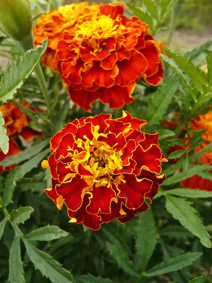 Отклоненные бархатцы характеризуются небольшими размерами и большим разнообразием окрасок и форм цветков. Кусты довольно приземистые и раскидистые, а самые низкорослые сорта образуют практически сплошные цветущие ковры. Ветвятся уже от основания поэтому на одном стебле может вырасти целый букет. Соцветия, диаметром до 6 см. Быстро зацветают и могут расти практически в любых условиях.
