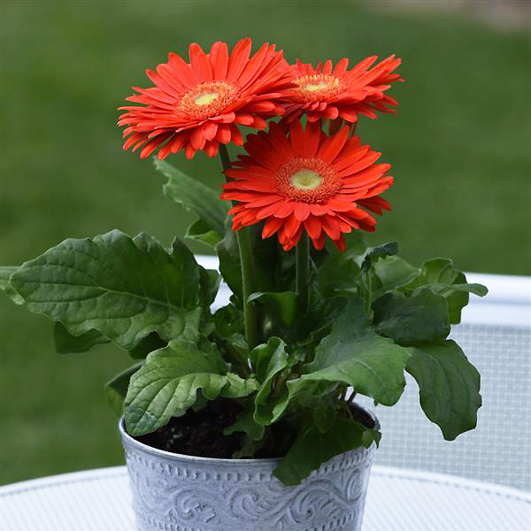 Оранжевая революция очень крупных ромашковидных соцветий до 12 см в диаметре. Самая выровненная по однородности цветения и размеру цветка серия гербер. Растения мощные, кустистые. Прекрасно себя чувствует на недостаточно освещённом окне. Подходит для выращивания и на дачных участках.