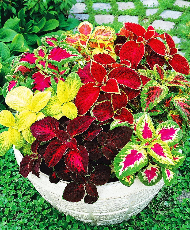 Знакомое Вам комнатное растение, которое можно выращивать и в открытом грунте. В течение лета колеус продемонстрирует всю роскошь своей листвы – комбинацию оттенков зелёного, жёлтого, бордового и красного цветов. Перед осенними заморозками растение можно выкопать, пересадить в горшок, обрезать до высоты 15 см, и выращивать на подоконнике до следующей весны.