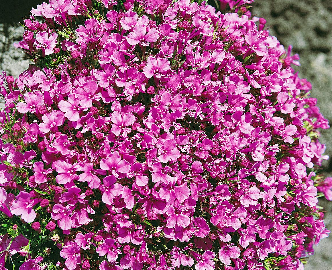 Шарообразный кустик, раннее цветение, насыщенный розовый цвет.