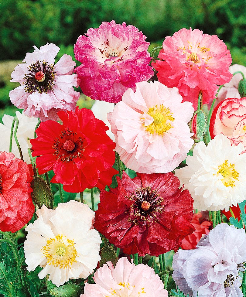 Атласные лепестки разнообразных оттенков — красного, розового, белого, оранжевого, часто с контрастными краями. В смеси не найдётся и двух одинаковых цветов. Махровые цветки на длинных цветоносах хорошо стоят в срезке. Оживят любой газон и цветник.