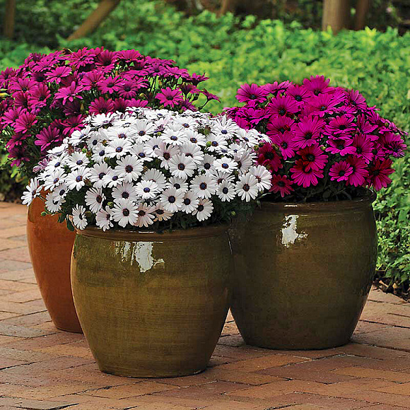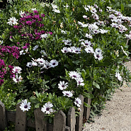 Самая компактная серия остеоспермумов, которая соответствует или даже превосходит любые вегетативные серии. Потрясающая однородность и восхитительные окраски ромашковидных соцветий, диаметром до 7 см. Цветки постоянно обновляются, не выгорают на солнце и не повреждаются сильными дождями. Растения компактные, пышно облиственные, с мощной корневой системой. Цветут до поздней осени. Не требуют прищипывания. Устойчивы к засухе.