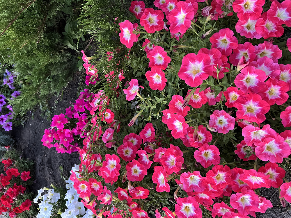 УХОД ЗА ПЕТУНИЕЙ В ГРУНТЕ. Уход за петунией в грунте заключается в регулярных умеренных поливах. В прополках и рыхлении она нуждается до того момента, пока она не заполнит собой сплошным ковром весь отведенный ей участок. Отцветшие цветки нужно своевременно удалять и за сезон несколько раз провести стрижку растений, после каждой стрижки петуния порадует вас вновь обильным кущением и цветением. Подкормки петунии, растущей в грунте в цветниках, нужны раз в 20 -30 дней любым минеральным комплексом для цветочных культур, предпочтительнее кормить по листу. Для петунии в клумбах с ограниченным объемом грунта, например клумба в шине, питание дают раз в 10 -14 дней. Для петуний, высаженных в небольшие кашпо или цветочные горшки, питание дают раз в 7 дней. Объем грунта в цветочном кашпо слишком мал, что бы надолго обеспечить обильное цветение без подкормок. Ампельные петунии любят покушать чаще всех, их кормят раз в 5 дней.