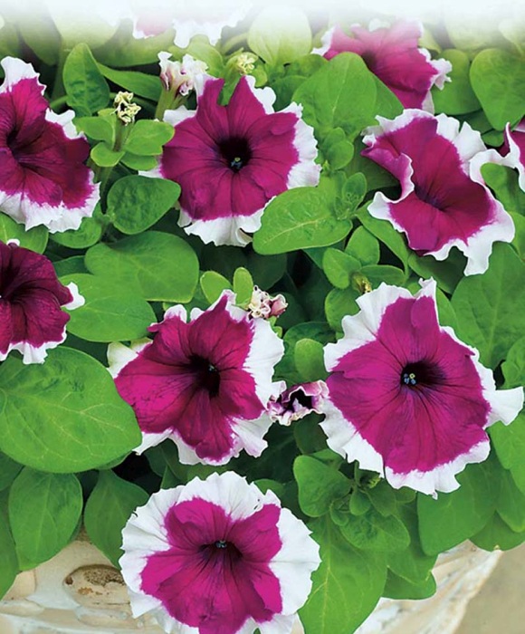 Эта группа занимает лидирующие позиции! Наибольшая гордость крупноцветковой петунии (грандифлора) — это крупные (диаметр 9-13 см!) цветы, простые или махровые с волнистыми краями, окрас от нежных пастельных оттенков до броских цветовых сочетаний. Куст пышный, ветвистый. Отличается ранним, обильным и продолжительным цветением.