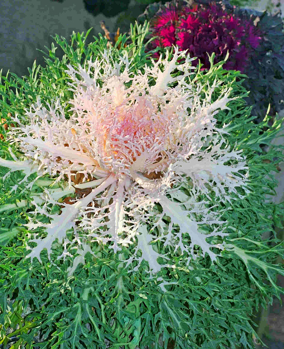 Капуста декоративная – «овощ-цветок», который еще и едят. Все ее части у большинства видов СЪЕДОБНЫ, но портить и съесть такую красоту всегда жалко. Она похожа одновременно и разноцветные гребешки, и на не высокие огромные розы, самых невероятных цветов и оттенков. Модница одним словом, ну как не вырастить такую прелесть? И на капусту в обычном понимании этого слова, она совсем не похожа. Самое главное ее достоинство – она не боится осенних заморозков и радует нас до самого снега, когда все цветы в саду уже давно увяли или замерзли. Эта красавица является не заменимым атрибутом любого ландшафтного дизайна, и самые скромные участки способна превратить в по-царски шикарные. Именно, осенью в самые заморозки - пик красоты этого растения, когда она покрытая тонкой корочкой льда, играет лучами света, похожая на огромные драгоценные самородки. Эта «фифа» и под снег уходит во всей своей благородной красе. Выращивается она через рассаду. Успевайте выбрать семена на ваш вкус. Вырастить ее не сложнее чем рассаду обычной капусты.