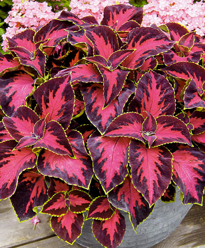 Шикарная окраска листьев с богатейшими цветовыми оттенками давно снискала славу этому замечательному многолетнему растению среди любителей комнатного цветоводства. В последнее время колеус всё чаще используется в однолетней культуре в садовом дизайне, как великолепное листовое декоративное растение. В открытом грунте теплолюбивый колеус не зимует, но сохраняет сочные цветовые оттенки и свежесть листьев всё лето, до осенних заморозков. Высота 30-36 см, в ширину разрастается до 25-30 см.