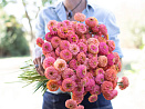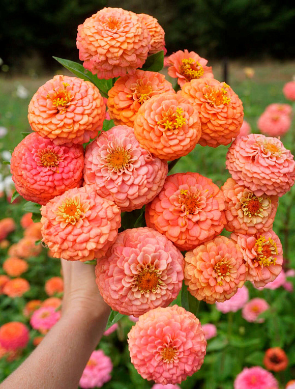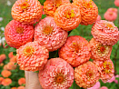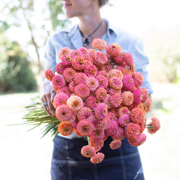 Очень продуктивная серия цинний. Пушистые, набитые лепестками соцветия-помпоны теплого лососево-персикового цвета. Цветет обильно, ярко и продолжительно. Чем чаще срезаешь, тем больше дает новых цветов. Стебли крепкие. Устойчива к мучнистой росе.
