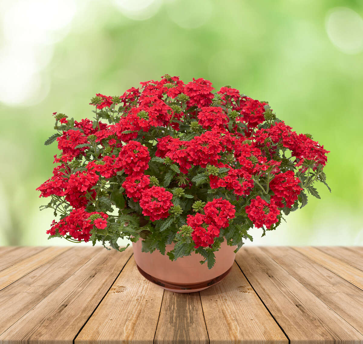 Первая и единственная в своем роде ампельная вербена. Полная устойчивость к мучнистой росе! Соцветия большие, яркие. Быстро зацветает и долго цветет. При посадке на клумбы образует настоящий ковер из цветов. Растения великолепно ветвятся и не требуют прищипки.