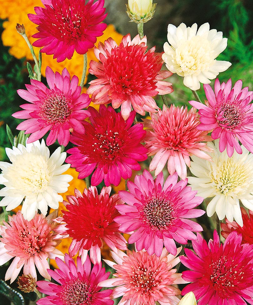 Привлекательный «бессмертник» из числа самых ярких и нарядных сухоцветов. Соцветия-корзинки 3-4 см в диаметре, махровые, реже — простые, розовые, пурпурные, лиловые, белые. После сушки великолепно сохраняют чистоту очень нежных и насыщенных оттенков. Цветёт с июля по сентябрь.