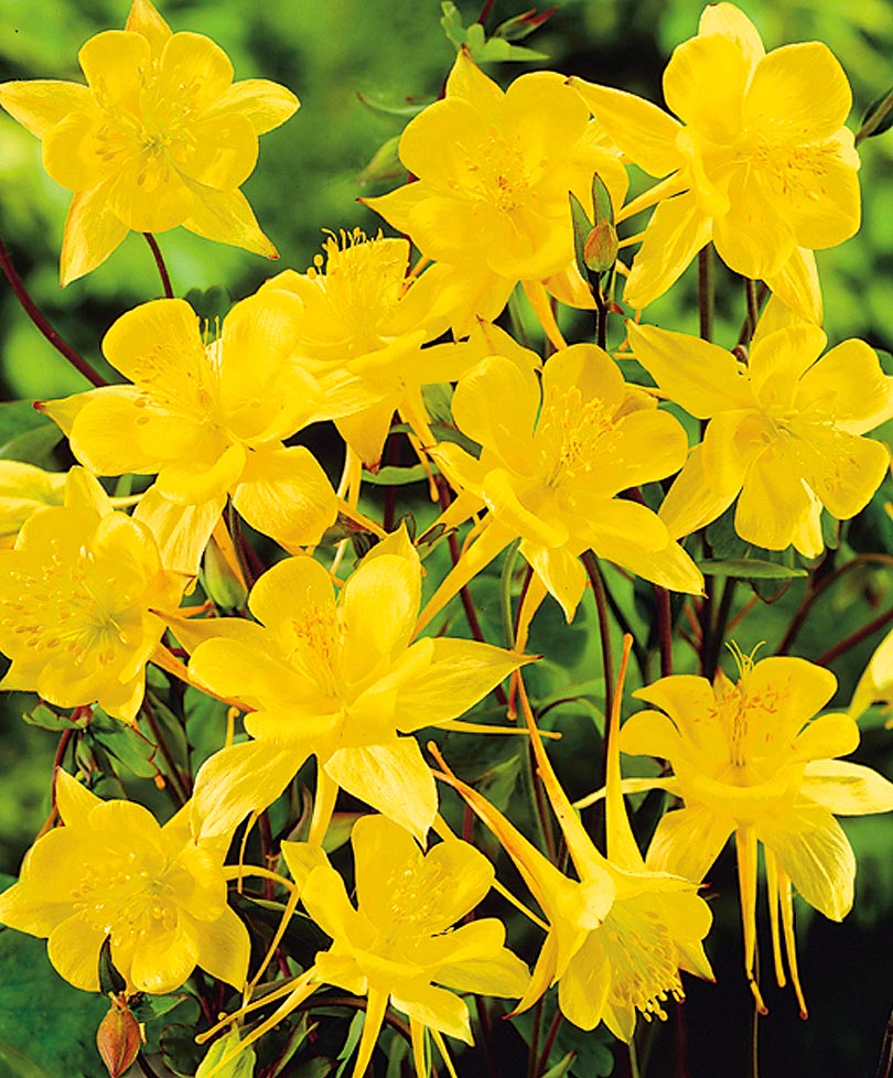 Цветки крупные, изящные, с нежными золотисто-жёлтыми лепестками и длинным шпорцем. Куст прямостоячий. Цветёт обильно и продолжительно, в июне-июле.