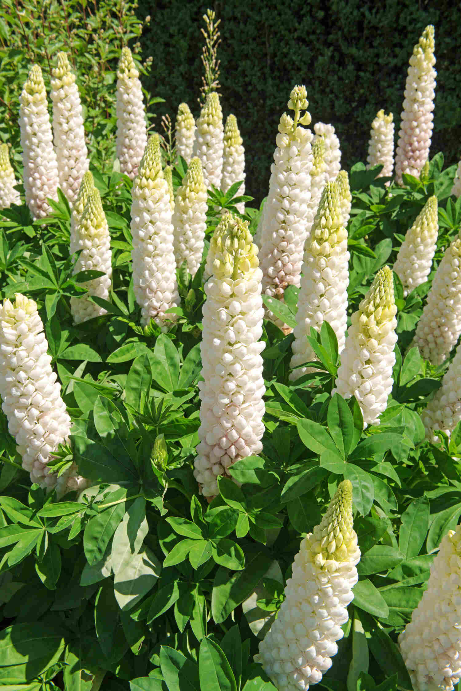 Эффектные одноцветные гибриды люпина Рассела особенно хороши в групповых посадках на газоне или массивами на дальнем плане. Растения мощные, с красивыми пальчато-сложными листьями, в зелени которых очень выразительные яркие плотные многоцветковые соцветия длиной до 45 см с крупными цветками размером около 2 см на строго вертикальных цветоносах.