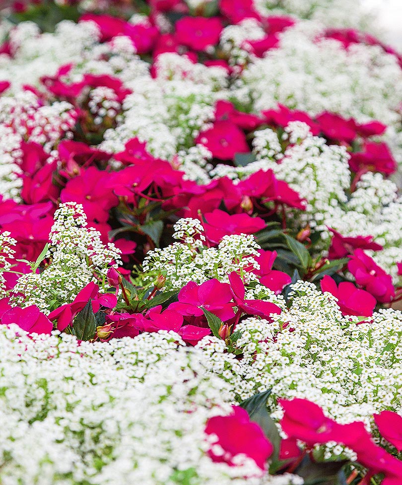 Всегда выигрышное сочетание насыщенного красного или лилового и снежно-белого. Воздушные облачка лобулярии и густые компактные кусты бальзамина, сплошь покрытые крупными цветами. Общая высота растений около 20 см. Хорошо растут вместе, не требуют много усилий для поддержания идеального внешнего вида в течение длительного времени. Лучшее решение для окантовки дорожек, краев цветников или подбивки кустарников. Для посадки желательно солнечное место.