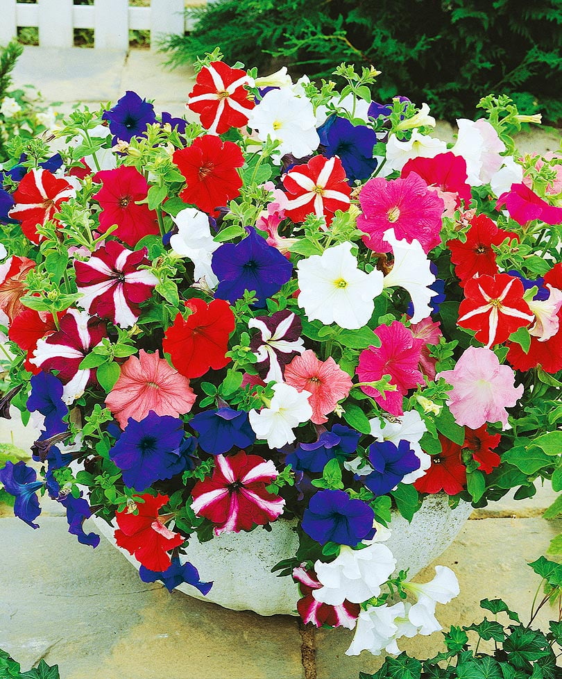 Все лучшие окраски в одном наборе! Веселое и яркое сочетание, придающее праздничное летнее настроение вашему саду. Одноцветные петунии – белые, лососевые, розовые и глубоко-синие и замечательные пурпурные и красные с белой звездой. Такое разнообразие окрасок, что каждый новый день не похож на предыдущий и так все лето! Цветы крупные около 8 см в диаметре. Общая высота смеси до 35 см. Применяется для создания плоских цветников, оформления балконов, окантовки дорожек. Отличительная особенность петуний из этого набора, обильное цветение и стойкость к неблагоприятной погоде.