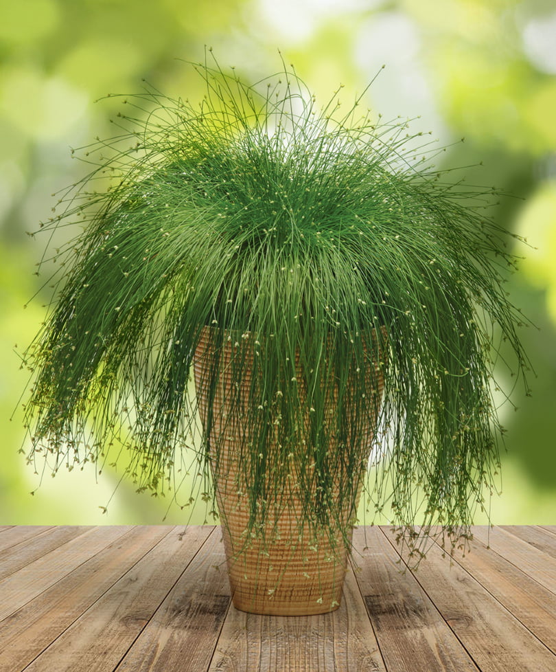 Оригинальная изящная осока, или камыш поникший, получившая за свою внешность необычное название «оптико-волоконная трава». Формирует пучки из тонких, 1-2 мм шириной, густо-зелёных листьев и упругих нитевидных стеблей, несущих на кончиках мелкие верхушечные колоски длиной 2-5 мм с крошечными серебристо-белыми или соломенно-золотистыми цветками, светящимися, как оптическое волокно. Растение многолетнее, теплолюбивое, в открытом грунте не зимует и как нельзя лучше подходит для выращивания в контейнерах или в качестве комнатного растения. В ширину разрастается до 50 см. Исключительно влаголюбив, не выносит известкованные почвы.