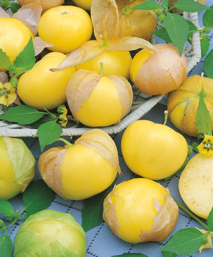 Это не обычный физалис. Его плоды по форме напоминают маленькие желтые томаты, а мякоть очень богата пектином (до 10% от сухой массы), желирующая способность которого в два раза выше, чем у яблок. Плоды плотные сочные приятного вкуса. Превосходны в свежих летних салатах. Из них готовят вкусную икру, солят и маринуют, как обычные помидоры. Растение однолетнее со стелющимися побегами. Плодоносит до заморозков.