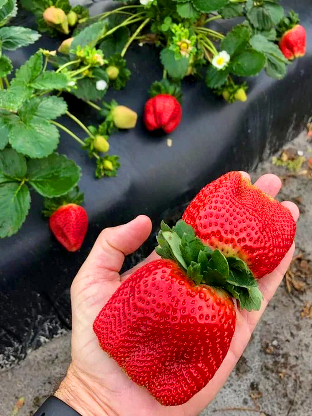 Лучше всего сажать землянику на грядки в 2 ряда для удобства ухода за ней. Расстояние между растениями в зависимости от сорта — 15—20, между рядами — 35—40 см. Гряды лучше всего располагать с севера на юг. Перед посадкой на уложенном чёрном укрывном материале делают крестообразные разрезы 10х10 см на расстояниях, указанных выше.
